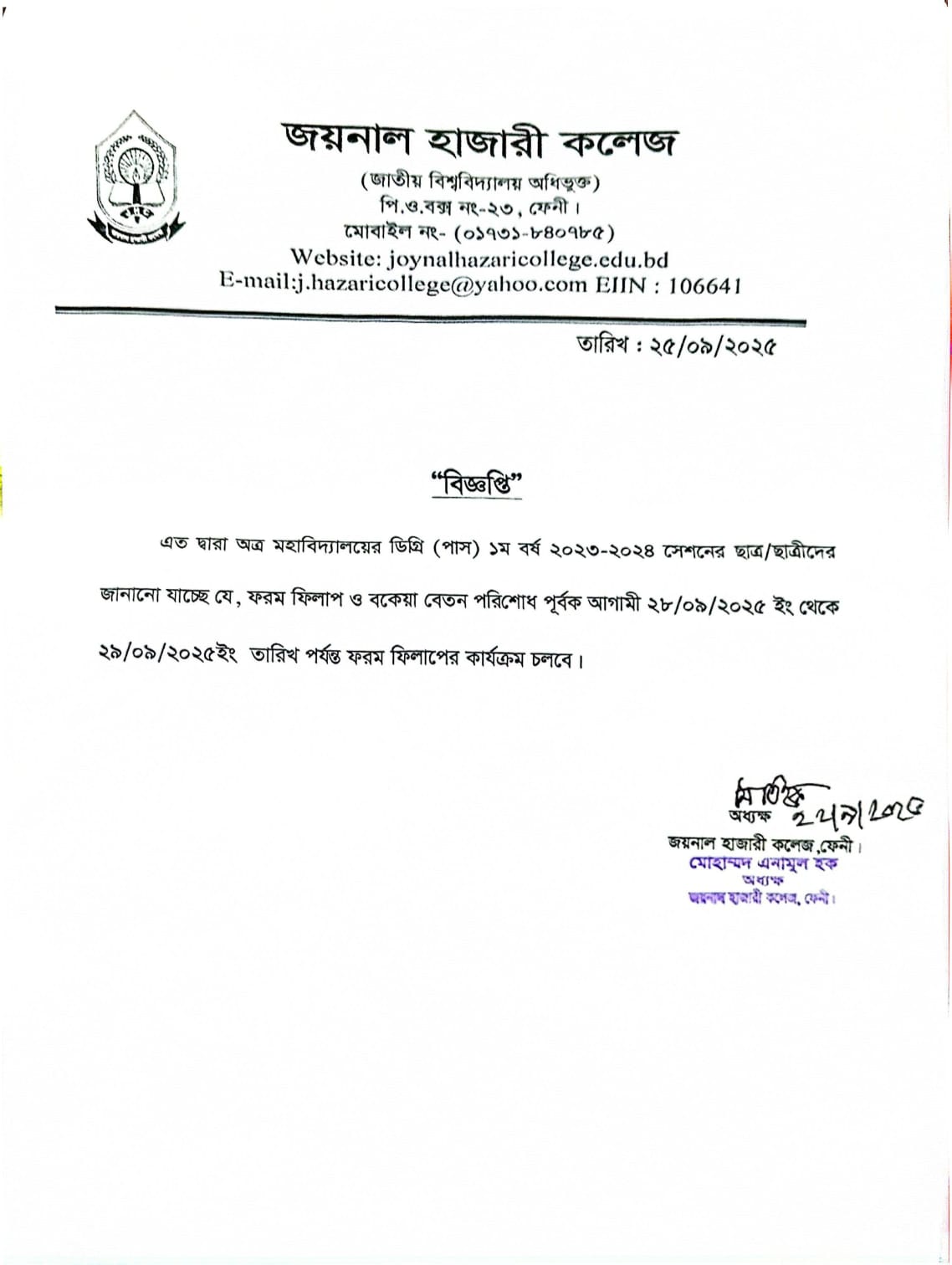 ডিগ্রি (পাস) ১ম বর্ষ২০২৩-২৪ সেশনের ফরম ফিলাপ ও বকেয়া বেতন পরিশোধ সংক্রান্ত বিজ্ঞপ্তি-